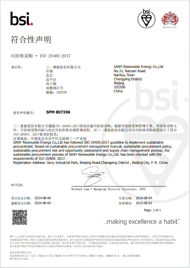在企业治理方面,三一重能将ESG指标纳入公司绩效考核体系,确保ESG战略的有效实施。同时,积极与国际接轨,学习借鉴国际先进企业的ESG管理经验,不断提升自身的ESG管理水平。此外,三一重能取得ISO37001反贿赂管理体系符合性声明,标志着公司治理水平再上新台阶。